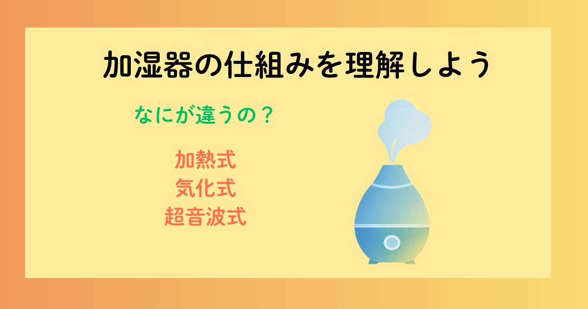 加湿器の代表的な加熱式、気化式、超音波式の仕組みと特徴をまとめています。