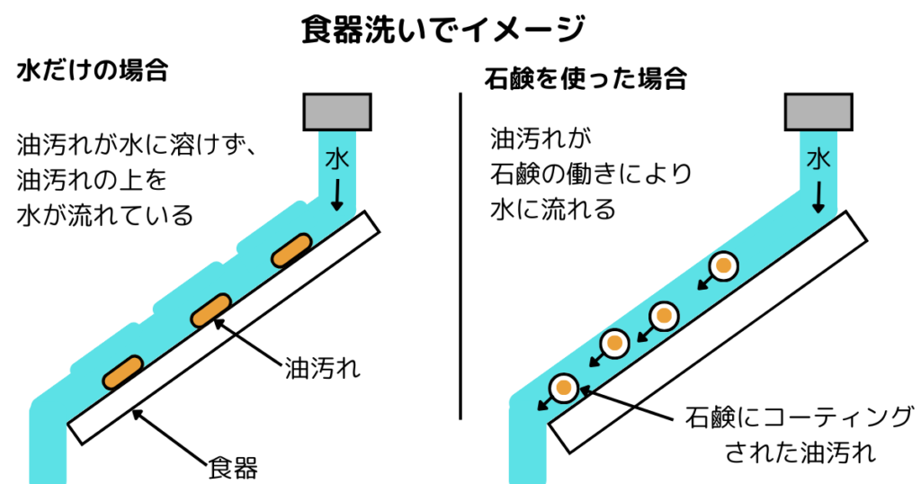 石鹸は油が水に溶け込むのを助ける働きがあります。この石鹸の働きにより、油汚れを水で落とすことができます。