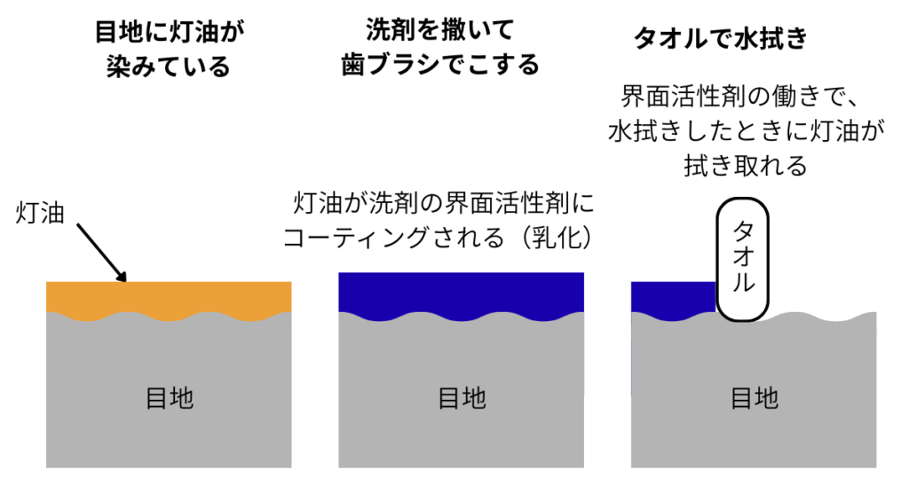 灯油と洗剤を歯ブラシでかき混ぜることによって、洗剤が油と接触しやすくなり、灯油の周りを界面活性剤で覆うことができます。