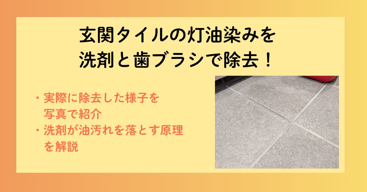 玄関のタイルについた灯油の染みを、洗剤を撒いて歯ブラシでこすることによって、実際に消した様子をご紹介しました。